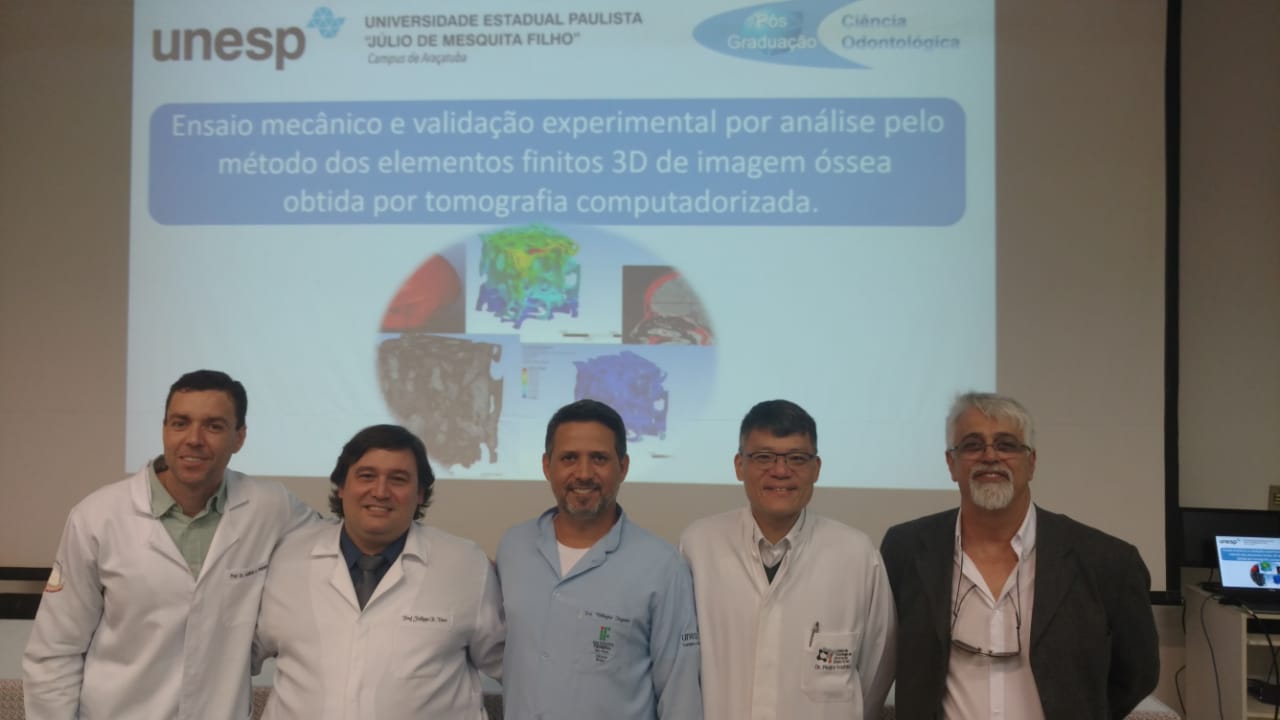 Sob o título Ensaio Mecânico e validação experimental por análise pelo método dos elementos finitos 3D de imagem óssea obtida por tomografia computadorizada. O Prof. Engº Mecatrônico Wellington, propôs, um trabalho interdisciplinar, juntando seus conhecimentos de mecânica e de modelamento matemático com a necessidade dos odontólogos no estudo sobre resistência de materiais na aplicação de próteses dentarias.