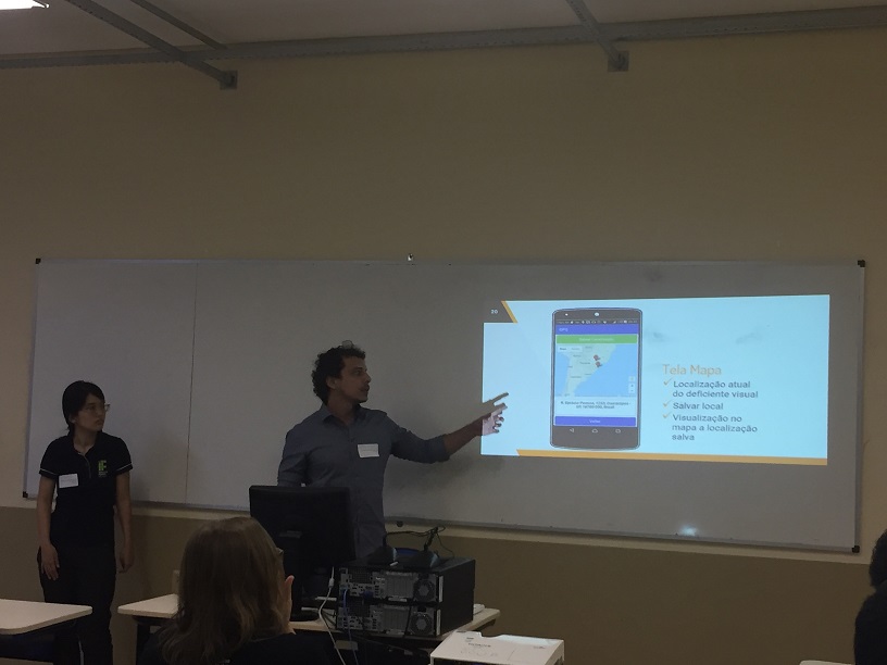 O trabalho intitulado APLICATIVO PARA AUXÍLIO A PESSOAS COM DEFICIÊNCIA VISUAL, apresentado por Katherine e Leonardo, foi elaborado como parte dos requisitos do TCC e apresenta a proposta de um aplicativo que trabalha em conjunto com um dispositivo – com uso de sensor ultrassônico e Arduíno – para detecção de obstáculos e emissão de alertas personalizáveis no smartphone, permitindo ao usuário selecionar o limite máximo para detecção de obstáculos (que varia de 50cm a 2 metros de distância).