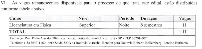 Processo seletivo para preenchimento das vagas remanescentes do curso de Física