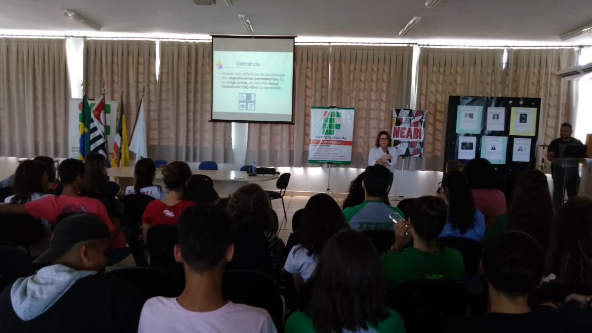 O trabalho, realizado em etapas, envolveu todos os alunos do campus e foi muito produtivo, especialmente porque as atividades foram realizadas conforme os perfis dos grupos participantes. Para o grupo do dia 29/04, que englobava os alunos dos cursos tecnólogos, técnicos e do Proeja, o evento aconteceu no auditório, mediado pelos membros NAPNE Anderson Gustavo Lahr, Carlos Roberto Bernardo Pereira, Samara Martha Cavalcante Cuppari da Silva e Bruna Morales, com a presença do psicólogo convidado Fabiano Boghossian Esperança, que proporcionou ao grupo uma grandiosa experiência a partir de seus relatos sobre a situação de deficiência visual total.
