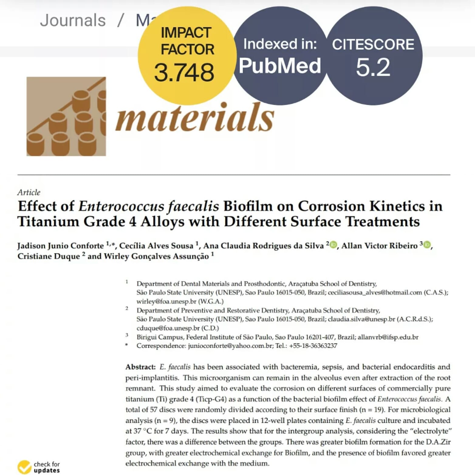 A colaboração entre a Faculdade de Odontologia de Araçatuba FOA-Unesp Campus Araçatuba e o LIFENano-IFSP Campus Birigui iniciou-se em 2019 por meio do trabalho de mestrado desenvolvido pelo pesquisador Jadison Junio Conforte sob a orientação do Prof. Dr. Wirley Gonçalves Assunção. Os desdobramentos dessa pesquisa resultaram na publicação do artigo. O artigo pode ser acessado pelo link https://www.mdpi.com/1996-1944/16/13/4532