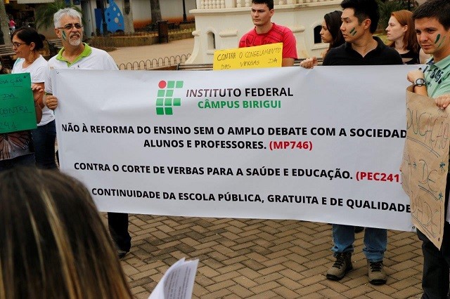 Alunos e servidores do IFSP, Câmpus Birigui tem se manifestado contra a MP 746, que propõe reforma no Ensino Médio e a PEC 241, a qual congela os investimentos em educação, saúde e assistência social por vinte anos.