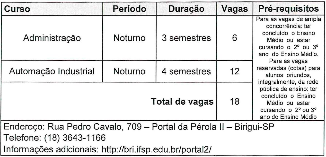 Dispõe sobre a abertura de PROCESSO SELETIVO SIMPLIFICADO para preenchimento das vagas remanescentes do processo seletivo do 2° semestre 2017 para os cursos Técnicos Concomitantes/Subsequentes do IFSP - Câmpus Birigui, na modalidade presencial. Os cursos são GRATUITOS.