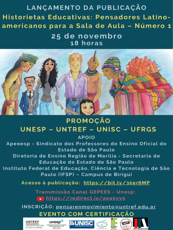 Será lançado oficialmente no dia 25/11/2020 (Quarta-feira) o livro Historietas Educativas: pensadores latino-americanos para a sala de aula, cuja proposta é trabalhar ideias e concepções de pensadores/pensadoras latinos/as americanos/as nas últimas séries do ensino fundamental e no ensino médio. Com isso, busca-se com isso a valorização de um pensamento próprio da América latina, que emerge da experiência e da realidade americana, invertendo a lógica de se valorizar apenas o conhecimento eurocentrado. Este volume contou com a tradução do professor Genivaldo de Souza Santos junto ao GEPEES (Grupo de Estudo e Pesquisa Educação, Ética e Sociedade), cujo lançamento no Brasil ocorrerá no dia 25/11/2020, contanto com o apoio oficial do IFSP – Campus Birigui.