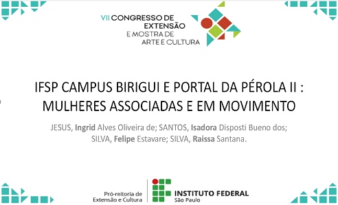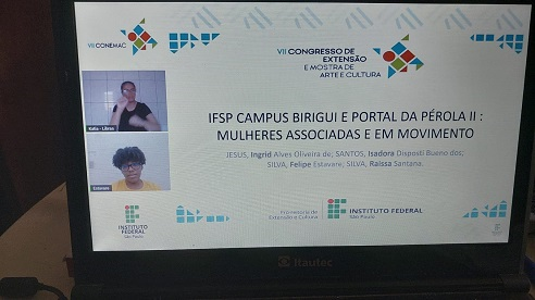 Na data de 28.11, o projeto de extensão intitulado “IFSP Campus Birigui e Portal da Pérola II : Mulheres Associadas e em Movimento”, foi apresentado em sessão de comunicação do VII Congresso de Extensão e VII Mostra de Arte e Cultura do IFSP (VII CONEMAC), pelo discente e bolsista do Ensino Médio Integrado em Informática, Felipe Estavare da Silva. O projeto que conta com outras três bolsistas da Engenharia da Computação (Ingrid Alves de Jesus, Isadora Bueno dos Santos e Raissa Santana da Silva), foi selecionado no âmbito do edital da PRX nº 479/2023.