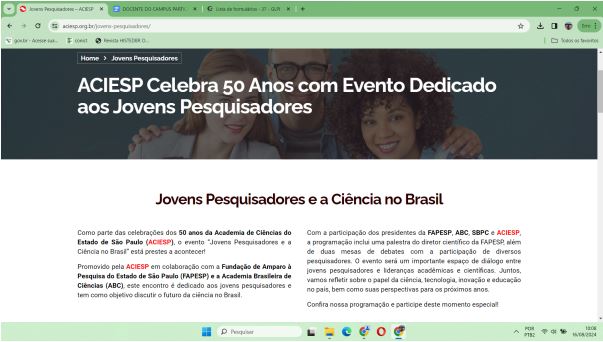 Nesta oportunidade de comemoração do Jubileu de Ouro da Academia de Ciências do Estado de São Paulo (ACIESP), cuja trajetória institucional iniciada em 1974, reafirma sua missão face ao fortalecimento da sociedade paulista “por meio da promoção do pensamento científico em suas decisões e do planejamento em todos os níveis”. O evento “Jovens Pesquisadores e a Ciência no Brasil”, com lotação máxima do auditório da FAPESP, contou com cientistas renomados (as) das mais proeminentes instituições acadêmicas e de pesquisa de São Paulo. Para ter acesso à mais informações sobre o evento e da Academia paulista acesse: <https://aciesp.org.br/>.