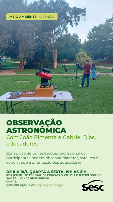 O Campus Birigui do IFSP receberá entre os dias 08 e 10 de janeiro a atividade de observação astronômica realizada pelo SESC - Birigui.