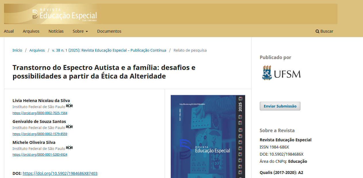 SILVA, Lívia Helena Nicolau da; SANTOS, Genivaldo de Souza.; SILVA, Michele Oliveira. Transtorno do Espectro Autista e a família: desafios e possibilidades a partir da Ética da Alteridade. Revista Educação Especial, v. 38, n. 1, 2025. e60/01-22. DOI: 10.5902/1984686X87403.
