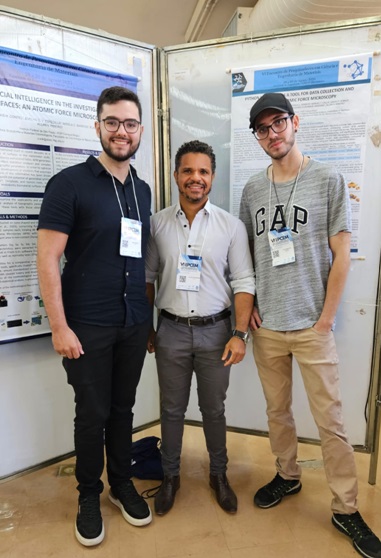 Registro da participação na sessão de pôsteres do VI Encontro de Pesquisadores em Ciência e Engenharia de Materiais. Prof. Dr. Allan Victor Ribeiro (centro), alunos Lucas H. Contel (direita) e Erik Zampieri (esquerda).