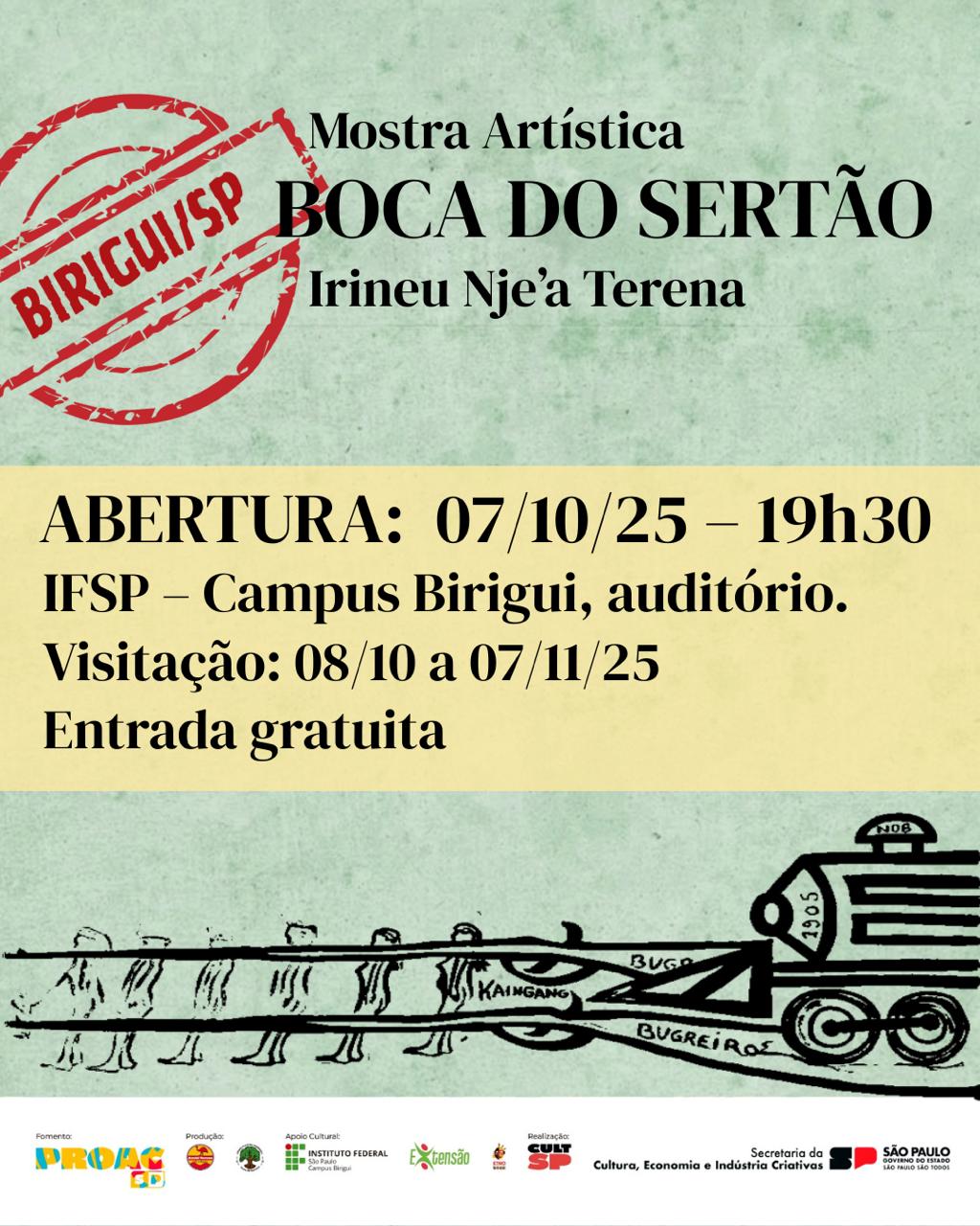 A Mostra Artística Boca do Sertão, de Irinei Nje'a Terena, com financiamento do PROAC, em exposição no auditório do Campus Birigui, em parceria com a Comissão Etno-Birigui, vem...
