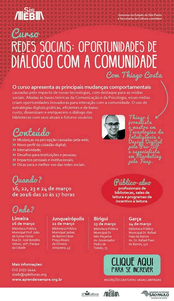 No dia 23 de março, a bibliotecária Amanda Martins Moraes representará o Campus participando de uma capacitação oferecida pelo SisEB (Sistema Estadual de Bibliotecas Públicas de São Paulo). O curso ministrado por Thiago Costa, jornalista e mestre em Tecnologias da Inteligência e Design Digital e especialista em Marketing, abordará o tema “REDES SOCIAIS: OPORTUNIDADES DE DIÁLOGO COM A COMUNIDADE”