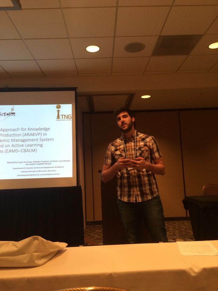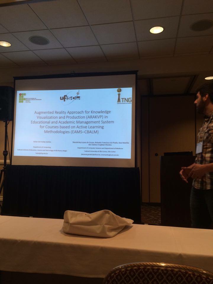 O artigo intitulado Augmented Reality Approach for Knowledge Visualization and Production (ARAKVP) in Educational and Academic Management System for Courses based on Active Learning Methodologies (EAMS–CBALM), em português Abordagem de Realidade Aumentada (RA) para Produção e Visualização do Conhecimento em Sistemas de Gestão Pedagógica e Acadêmica para Cursos Baseados em Metodologias Metodologias Ativas de Aprendizagem (CBMAA), apresenta uma parte do estudo de doutorado da professora Helen De Freitas Santos. Tal estudo tem o objetivo de analisar o uso da RA em CBMAA nos momentos em que o estudante realiza a aprendizagem autodirigida. O artigo foi apresentado pelo aluno Gabriel de Freitas Santos Sábio, que é bolsista do PIBIFSP e atualmente está pesquisando sobre linguagem de programação para RA usando kinect da Microsoft a fim de implementar uma parte da tecnologia a ser construída durante a pesquisa da professora.