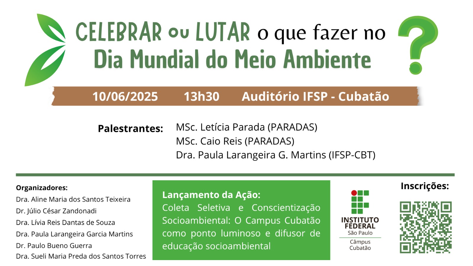 Campus Cubatão convida para a palestra Celebrar ou Lutar: o fazer no Dia Mundial do Meio Ambiente, que vai acontecer dia 10 de junho, às 13h30, no auditório do...