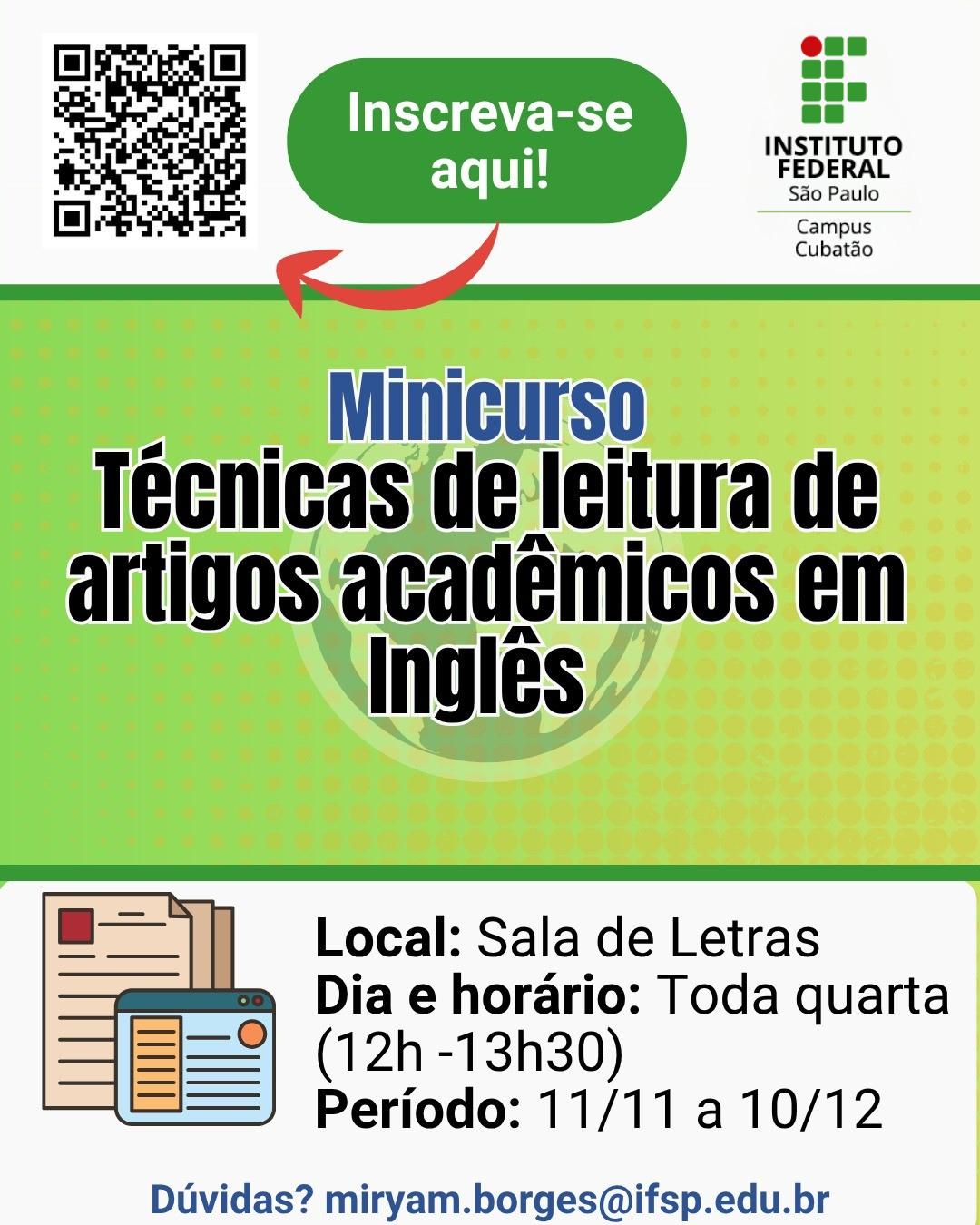 O Campus Cubatão di IFSP promove, entre os dias 12 de novembro e 10 de dezembro, o minicurso “Técnicas de Leitura de Artigos Acadêmicos em Inglês”, voltado à comunidade...