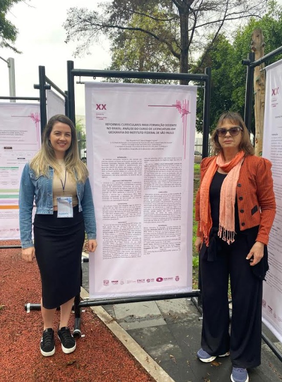 Durante o encontro, Taís apresentou, em formato de pôster, o trabalho “Reformas curriculares para formação docente no Brasil: análise do curso de Licenciatura em Geografia do Instituto Federal de São Paulo”, desenvolvido em coautoria com a Prof.ª Dra. Núria Hanglei Cacete (FE-USP), no eixo temático “Geografía de la educación y de la enseñanza”.