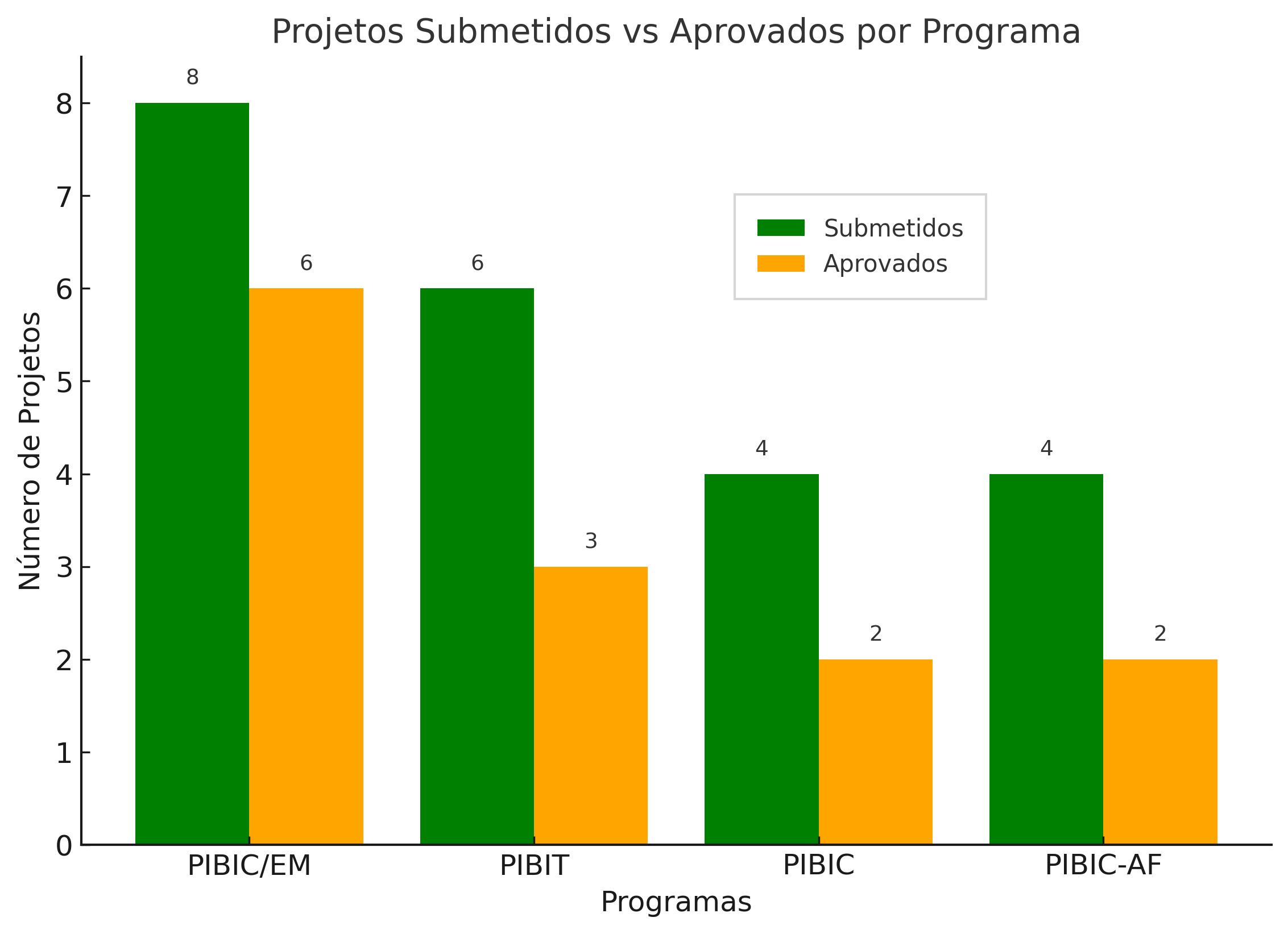 10 projetos foram aprovados, sendo que 6 deles foram contemplados com bolsas no valor de R$ 700,00 por 20 horas semanais de dedicação ao projeto, e 4 iniciações são desenvolvidas de forma voluntária.