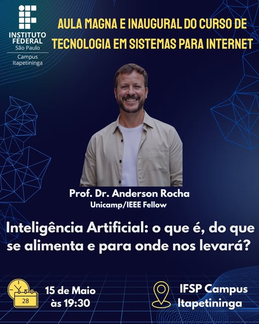 Aula Magna e Inaugural do curso de Tecnologia em Sistemas para Internet "Inteligência Artificial: o que é, do que se alimenta e para onde nos levará?"Palestrantes: Local: Saguão do IFSP Campus Itapetininga |