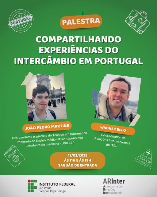 Palestra Compartilhando Experiências do Intercâmbio em PortugalParticipação de João Pedro Martins, egresso do Técnico Integrado em Informática do IFSP Itapetininga e estudante de Medicina na UNIFESP, compartilhando sua vivência em Portugal, e do Coordenador de Relações Internacionais do IFSP, Wagner Belo, apresentando oportunidades de intercâmbio e internacionalização para os estudantes. Local: Saguão do IFSP Campus Itapetininga |