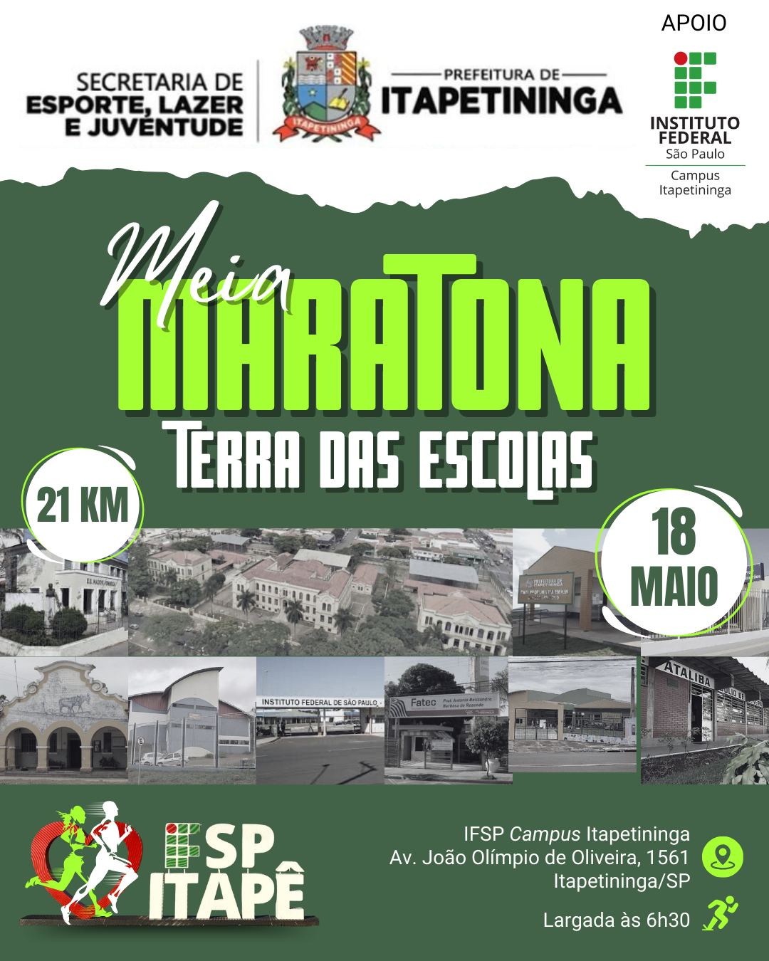 Meia Maratona Terra das EscolasPromovida pela Secretaria de Esporte, Lazer e Juventude da Prefeitura de Itapetininga, em parceria com o IFSP Campus Itapetininga, marcando as comemorações dos 15 anos do Campus. Local: IFSP Campus Itapetininga |