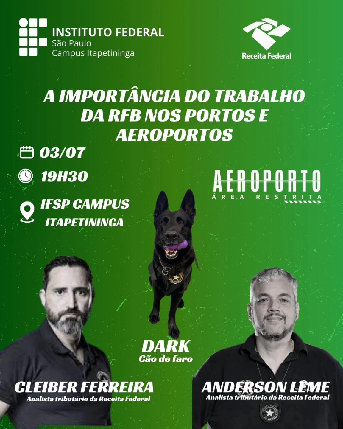 Palestra "A importância do trabalho da RFB nos portos e aeroportos"Palestrantes Cleiber Ferreira (RFB) e Anderson Leme (RFB), conhecidos pelo público do programa Aeroporto: Área Restrita, onde mostram a atuação da Receita Federal na linha de frente da segurança nos aeroportos e portos. Local: IFSP Campus Itapetininga |