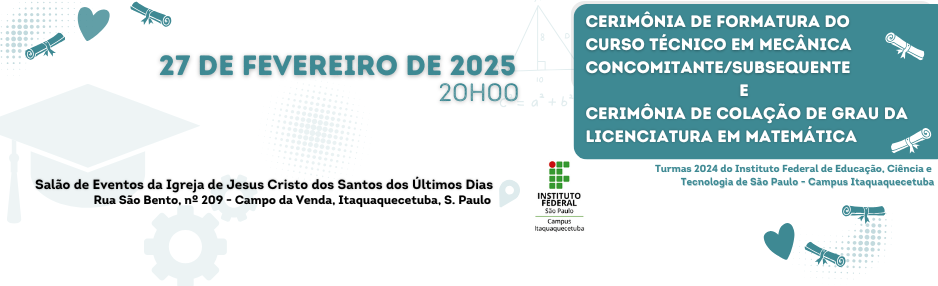 A DIREÇÃO DO INSTITUTO FEDERAL DE EDUCAÇÃO, CIÊNCIA E TECNOLOGIA DE SÃO PAULO - IFSP - CAMPUS ITAQUAQUECETUBA, juntamente com a Comissão de Formatura, vem, através deste, convidar toda a comunidade acadêmica para o evento oficial de Cerimônia de Formatura das turmas do curso de Técnico em Mecânica (modalidade concomitante/subsequente) e Colação de Grau do curso de Licenciatura em Matemática, formandos do ano de 2024, que serão realizadas na data de 27 de fevereiro de 2025, a partir das 20:00 horas, no Espaço Salão de Eventos da Igreja de Jesus Cristo dos Santos dos Últimos Dias, sito na Rua São Bento, número - 209, Bairro - Campo da Venda, na cidade de Itaquaquecetuba/SP.