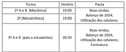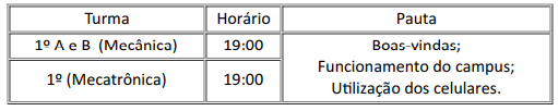 A Direção do Instituto Federal de Educação, Ciência e Tecnologia de São Paulo Campus Itaquaquecetuba, no uso de suas atribuições, convoca os responsáveis dos estudantes dos cursos técnicos integrados ao Ensino Médio para reunião de boas-vindas. A alteração das datas previstas se deu em razão da recepção dos estudantes dos cursos noturnos. A reunião será realizada presencialmente no Auditório Paulo Freire (Sala A12 do campus), conforme cronograma a seguir: