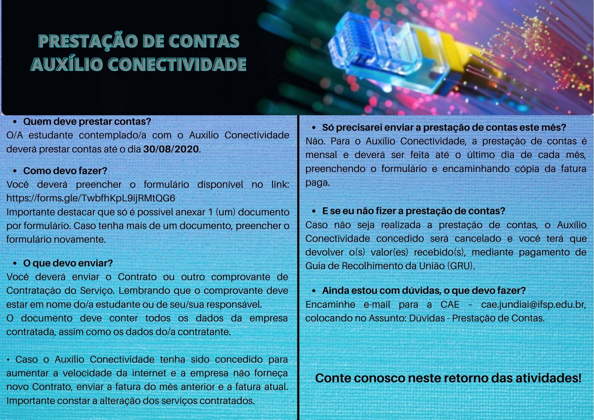 9.2 Para prestação de contas em relação ao Auxílio Conectividade, o estudante beneficiado deverá encaminhar a cópia do contrato de serviços até o dia 30 de agosto de 2020.