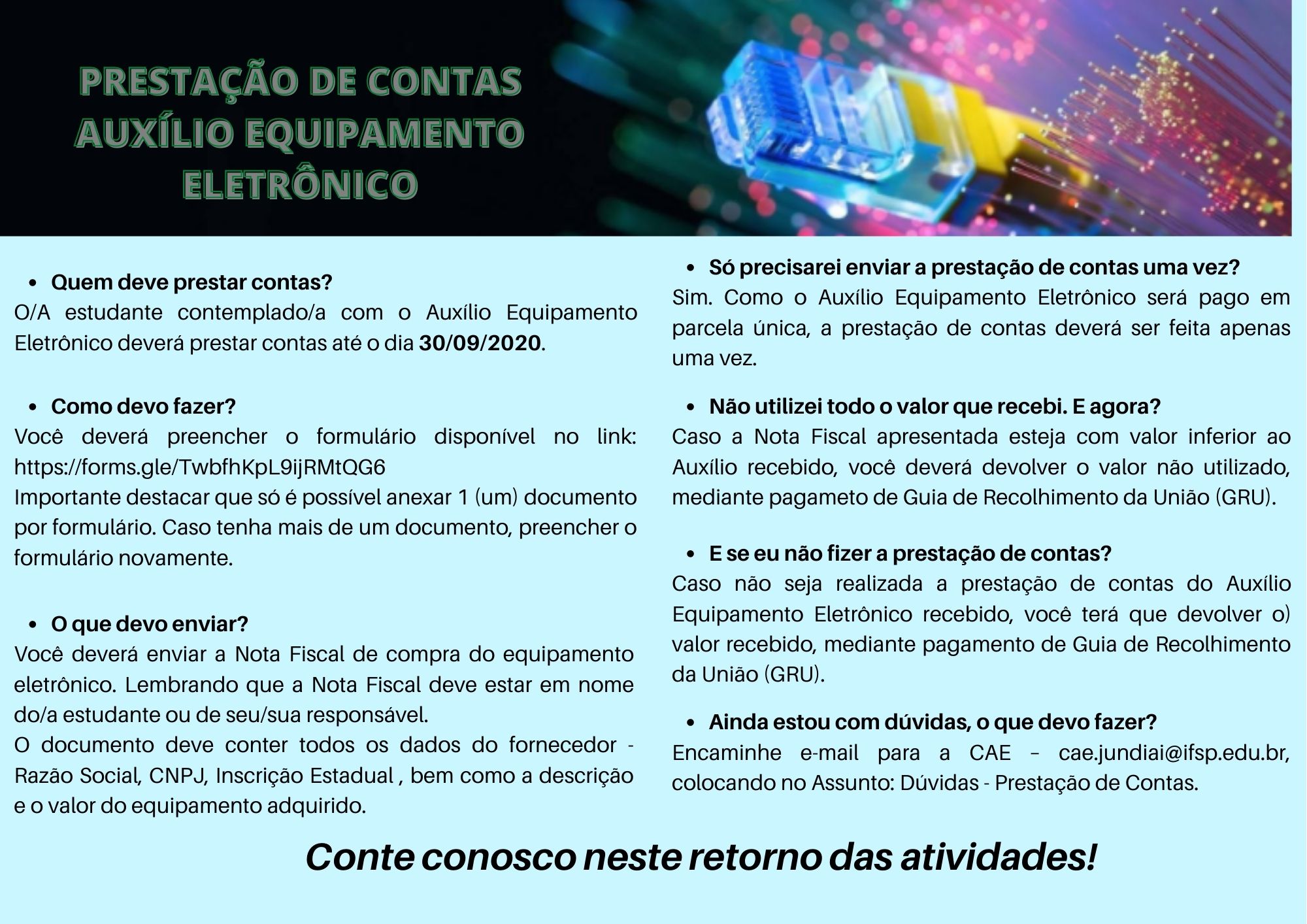 9.3 Para prestação de contas em relação ao Auxílio Equipamento Eletrônico, o estudante beneficiado deverá encaminhar a nota fiscal de compra até o dia 30 de setembro de 2020.