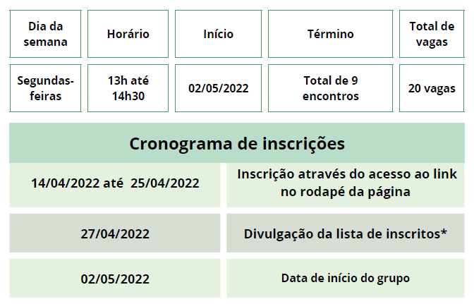 O grupo terá duração de 9 encontros presenciais, que ocorrerão às segundas-feiras, das 13h até 14h30.
