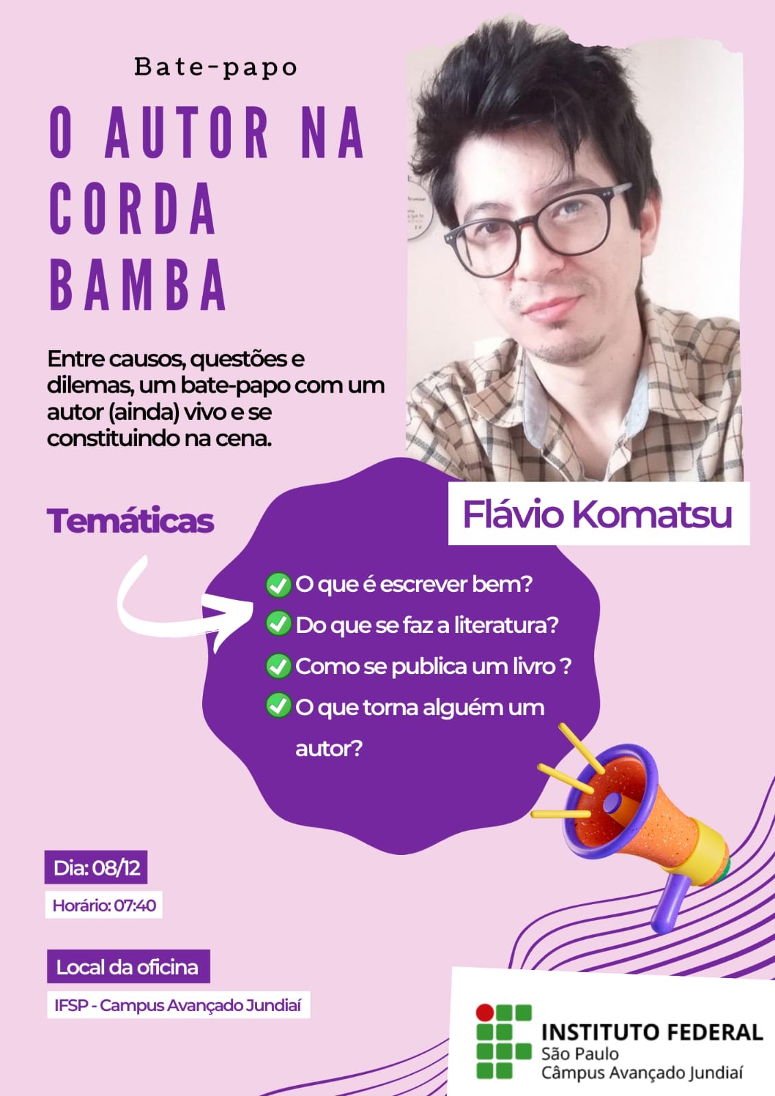 Participem do bate-papo com o poeta Flávio Komatsu. Acontecerá dia 08/02/2022, às 7:40, no IFSP Jundiaí. Será emitido certificado para os participantes.