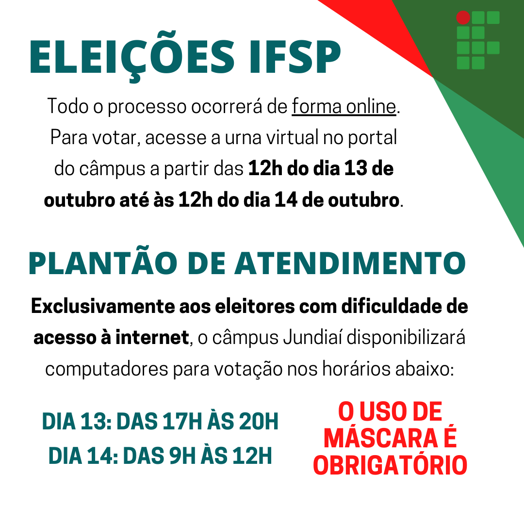 A COMISSÃO ELEITORAL LOCAL DO CÂMPUS JUNDIAÍ, instituída pela Resolução nº 32, de 18 de agosto de 2020 e com base na Portaria nº. 3177, de 31 de agosto de 2020, informa que as eleições para escolha de Reitor e Diretor-Geral ocorrerão de forma online, a partir das 12h do dia 13 de outubro até às 12h do dia 14 de outubro de 2020.