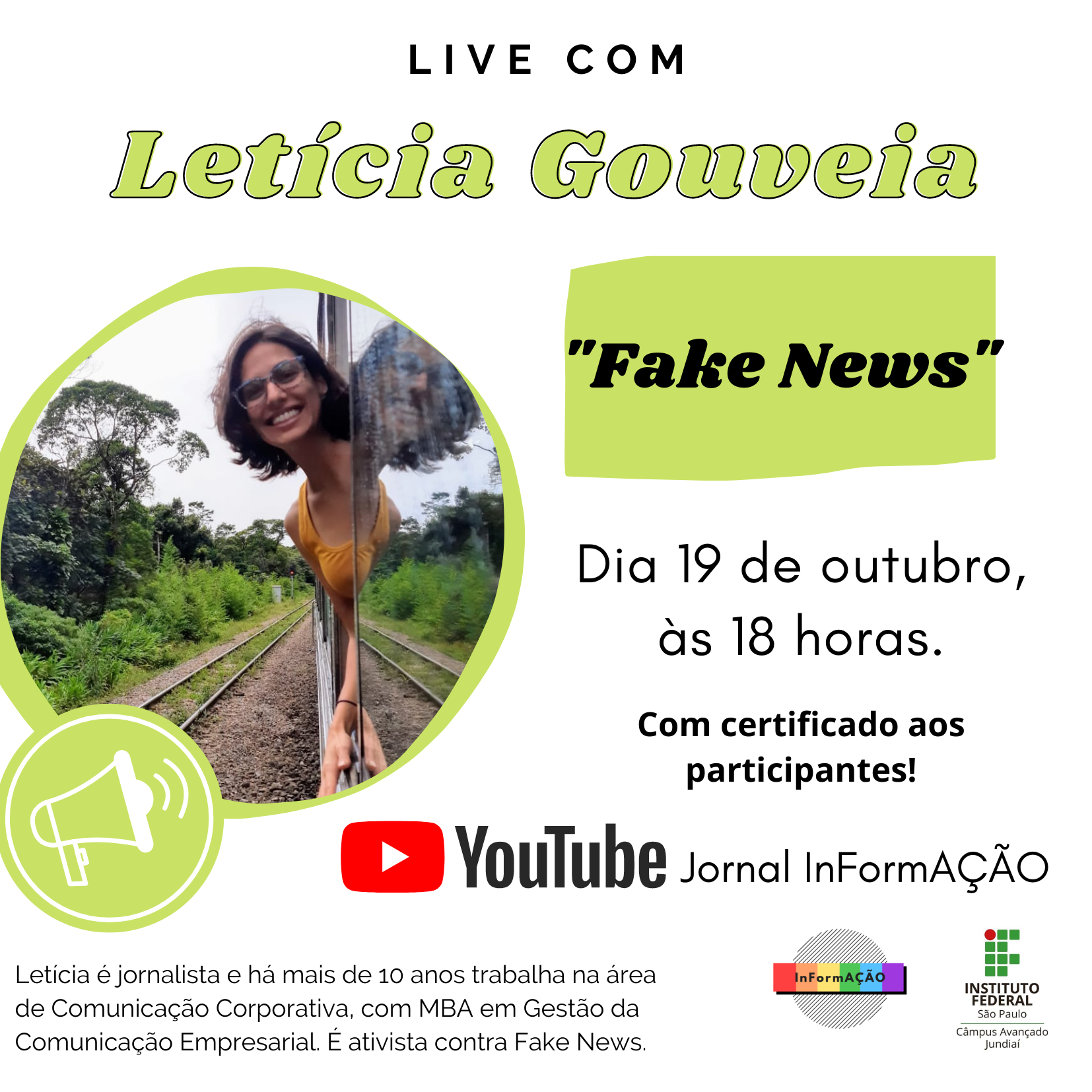 O Jornal InFormAÇÃO, totalmente escrito e produzido por alunos do Câmpus Jundiaí, recebe hoje (19/10), às 18h, a jornalista Letícia Gouveia, para tratar de um tema que perpassa o cotidiano de todos na atualidade. Sabemos que as chamadas “fake news” são amplamente difundidas e se espalham rapidamente por meio de grupos sociais, grupos em que também estão nossos estudantes. Nesse sentido, a palestra visa a contribuir com a formação integral dos educandos, tendo em vista que a temática extrapola o ambiente escolar.