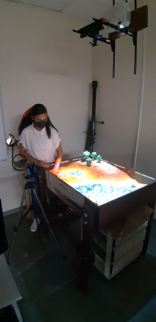 A ex-aluna do curso técnico em logística integrado ao ensino médio e atualmente aluna do curso de Ciências Biológicas da Universidade Federal de São Carlos (UFSCar), Rauany da Silva Pessoa, retornou ao nosso Câmpus para realizar um trabalho do seu curso de graduação com o auxílio da SARNDBOX (Caixa de Areia de Realidade Aumentada). Quando era estudante de ensino médio no IFSP, Rauany participou como voluntaria e posteriormente como bolsista no projeto de ensino, que levou à construção da caixa e ao desenvolvimento de aplicações pedagógicas para a ferramenta.
