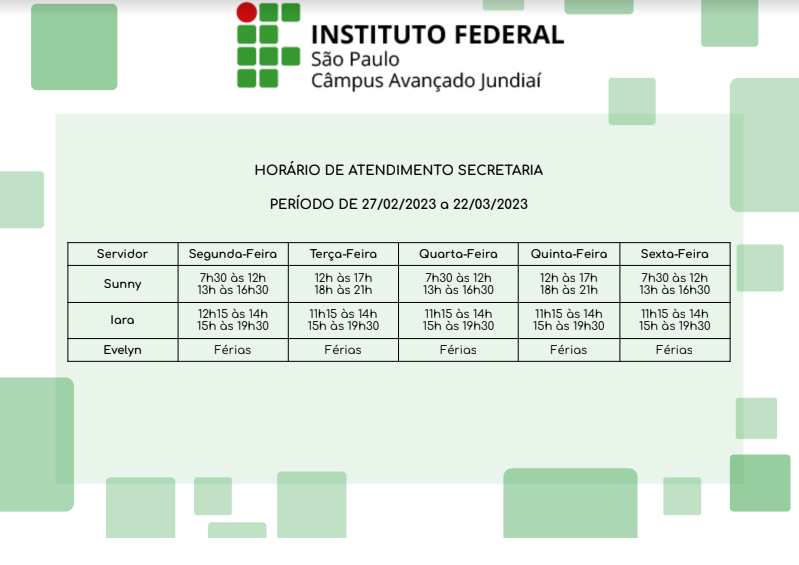 Veja abaixo o horário de atendimento da Secretaria entre os dias 27/02 e 22/03/2023.