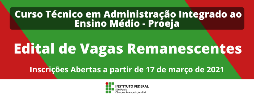 Edital de vagas Remanescentes Curso Técnico em Administração Integrado ao Ensino Médio - Proeja. Edital: Clique aqui Pré-requisito: ter concluído o Ensino Fundamental e idade...