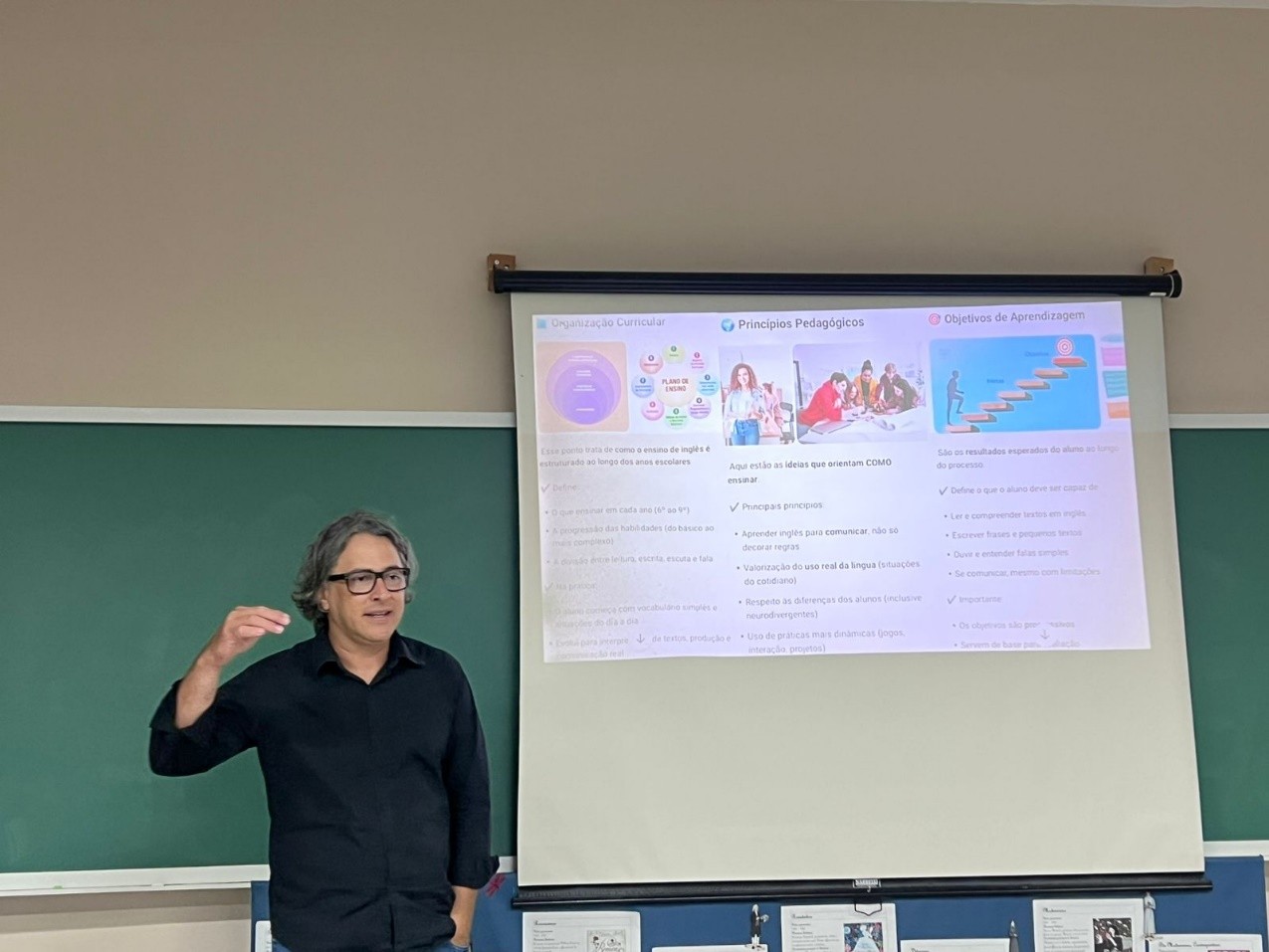 Durante a apresentação, o convidado abordou a organização do Currículo Paulista para os anos finais do Ensino Fundamental, destacando conteúdos, orientações pedagógicas e materiais didáticos utilizados na rede estadual. Também foram discutidos conceitos fundamentais para o ensino contemporâneo de línguas, como o inglês como língua franca, a valorização da diversidade cultural e o reconhecimento das múltiplas formas de uso da língua.