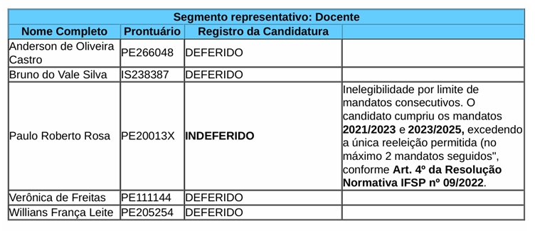 Desta forma, o candidato abaixo, que teve a candidatura DEFERIDA, passa a ter o registro INDEFERIDO por ter cumprido dois mandatos consecutivos (2021/2023 e 2023/2025), o que o impede de concorrer ao pleito 2025/2027.