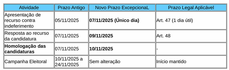 Observação: O prazo para recurso será aberto exclusivamente para o candidato Paulo Roberto Rosa no dia 07/11/2025, e a Comissão Eleitoral analisará o recurso e publicar a decisão final para homologação no dia 10/11/2025.