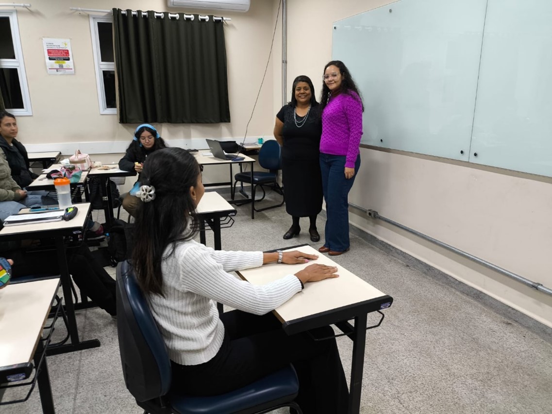 Alunos do sexto termo atentos à apresentação da aluna bolsista Renata