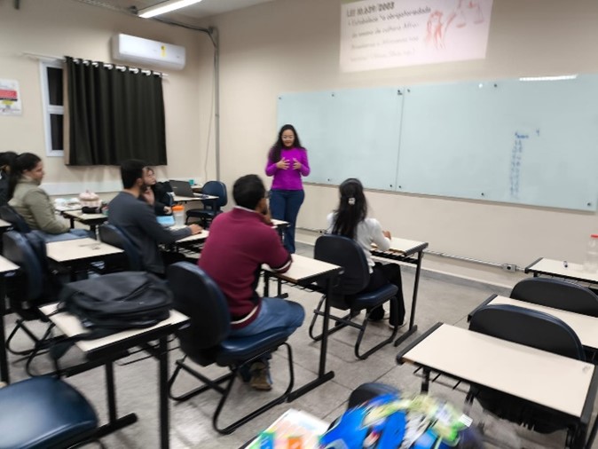 No último dia 12 de junho, a aluna Renata Gomes Pereira, do sexto termo do curso de Licenciatura em Letras Português e Inglês do IFSP – PEP, e bolsista de Projeto de Iniciação Científica, apresentou e comentou com os alunos de sua turma a importância da lei 10.639/2003 que institui a obrigatoriedade do ensino da cultura afro-brasileira na escola básica. A estudante salientou como o estudo das obras literárias dos países africanos contribui de maneira significativa para esse ensino.